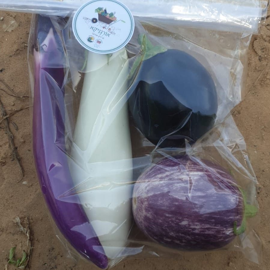 מארז המורכב מ- חציל בלאדי, חציל לבן, חציל זברה, וחציל אצבע יפני