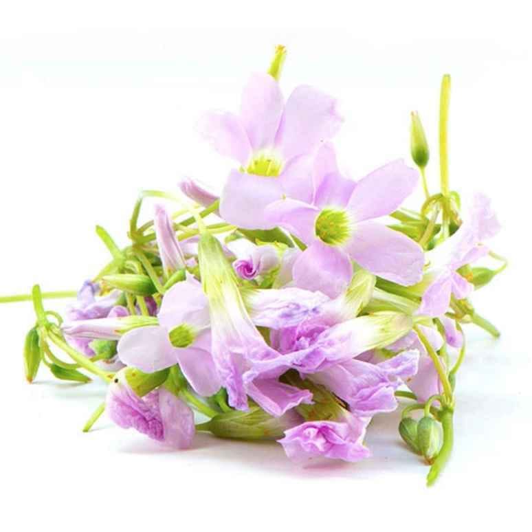 פרחי [חמציץ] סגולים ויפיפיים טעמם חמוץ ומרענן כמו הגבעול המוכר. מתאים לקינוחים וקישוט מנות (אכיל כמובן)