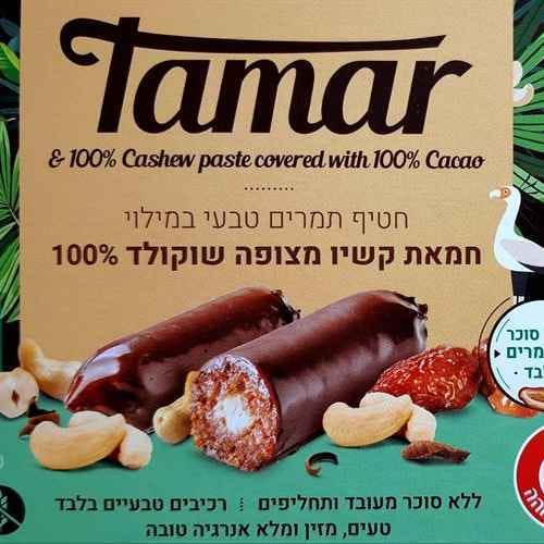 תמרים (75%) ממרח קשיו קלוף טבעי (15%) שוקולד 100% קקאו אורגני (10%) (עיסת קקאו אורגני, חמאת קקאו אורגני)